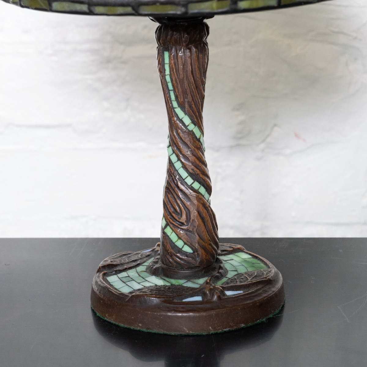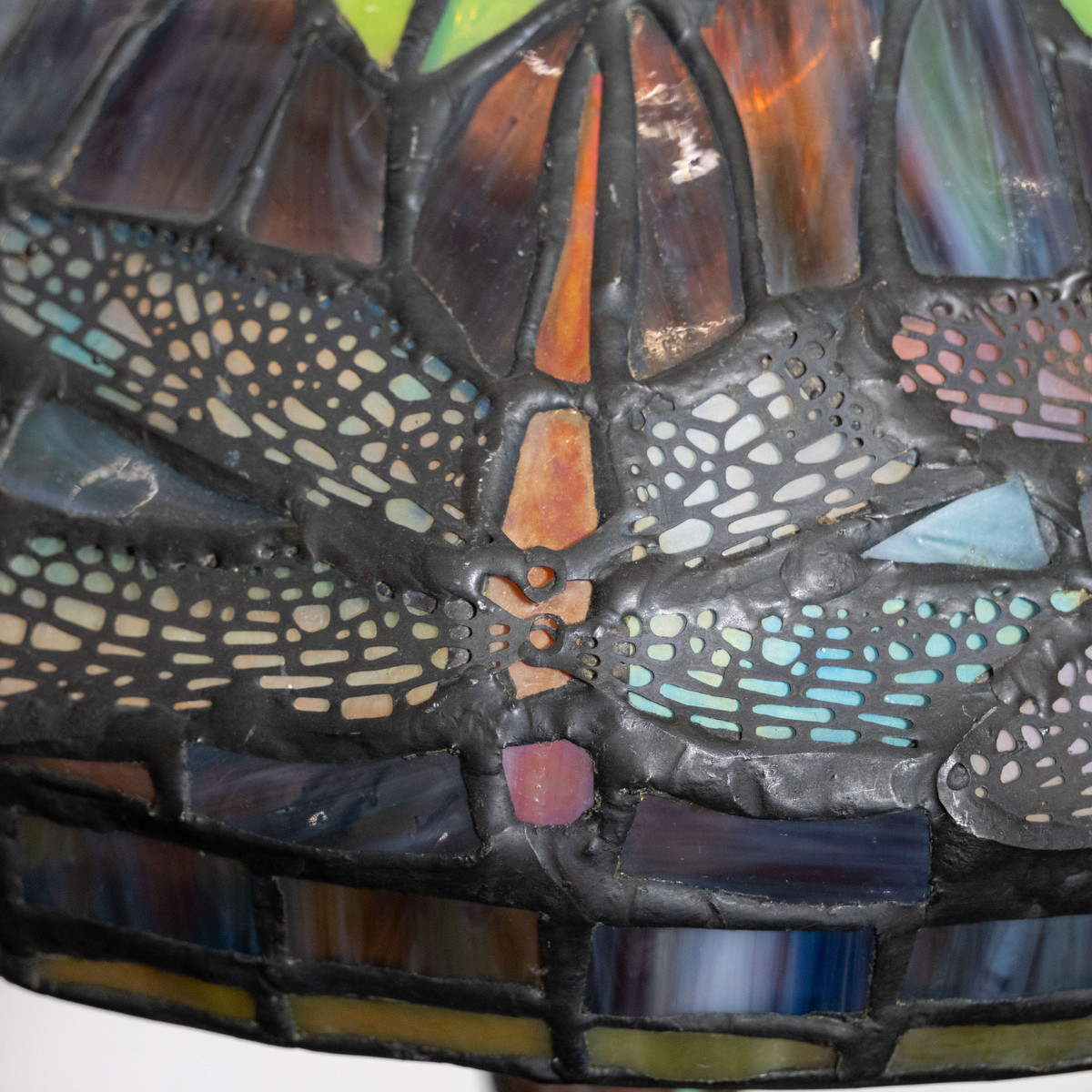 Single small table lamp with inlaid glass and openwork metal shade in the style of Lalique.
