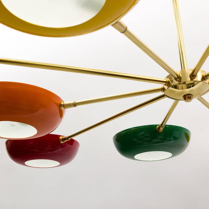 Ten-arm chandelier in brass and multicolored shades. Frosted glass fittings at the bottom of each standard base.In the Manner of: Stilnovo